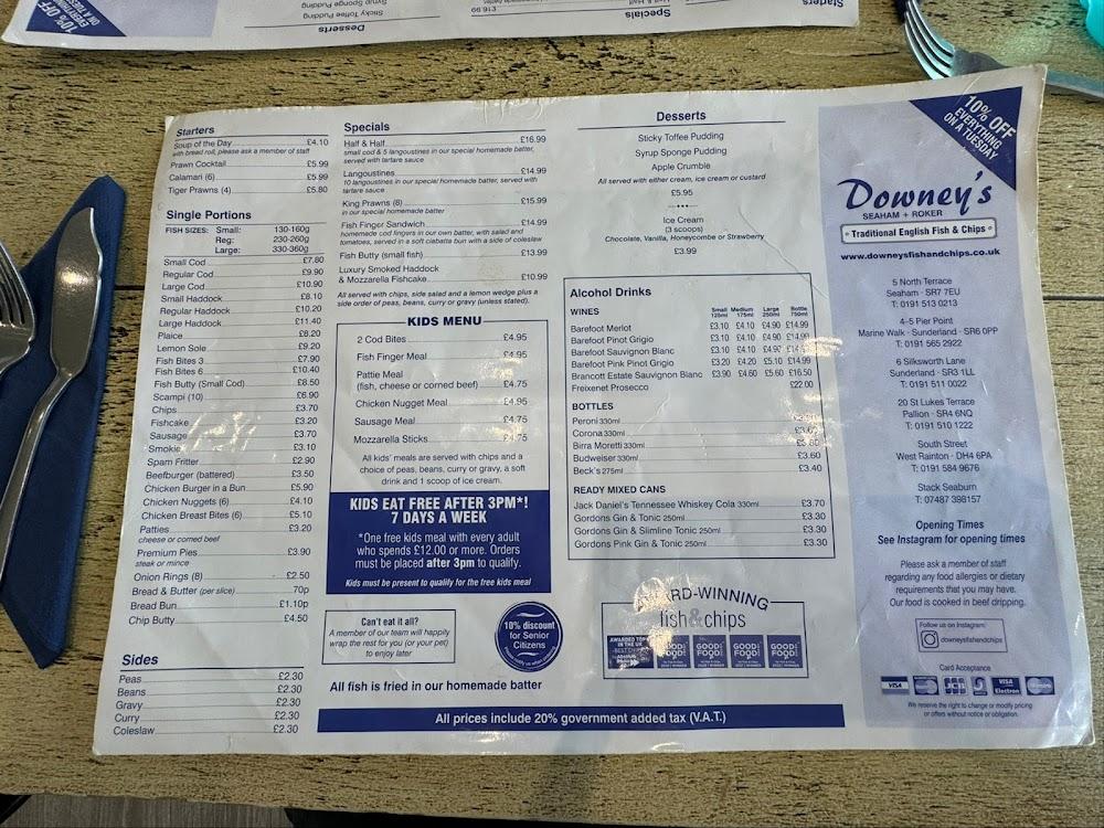 Located at 3 Marine Walk, Roker, Sunderland, Downey's captures the essence of a classic British fish and chip shop with a twist. With easy access for all, including wheelchair users, the restaurant welcomes everyone to savor its delights. A short distance from the coastline, Downey's is an ideal stop for beachgoers looking to feast on fish and chips. The vibrant atmosphere welcomes groups, solo diners, and families alike, creating a lively dining scene.